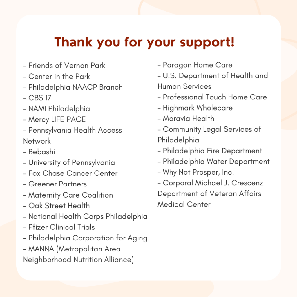 A huge shoutout to Philadelphia College of Osteopathic Medicine for their consistent support year after year. Their dedication to community wellness is truly inspiring. We also extend our gratitude to the Black Voters Matter Fund for their invaluable support in making this event possible.